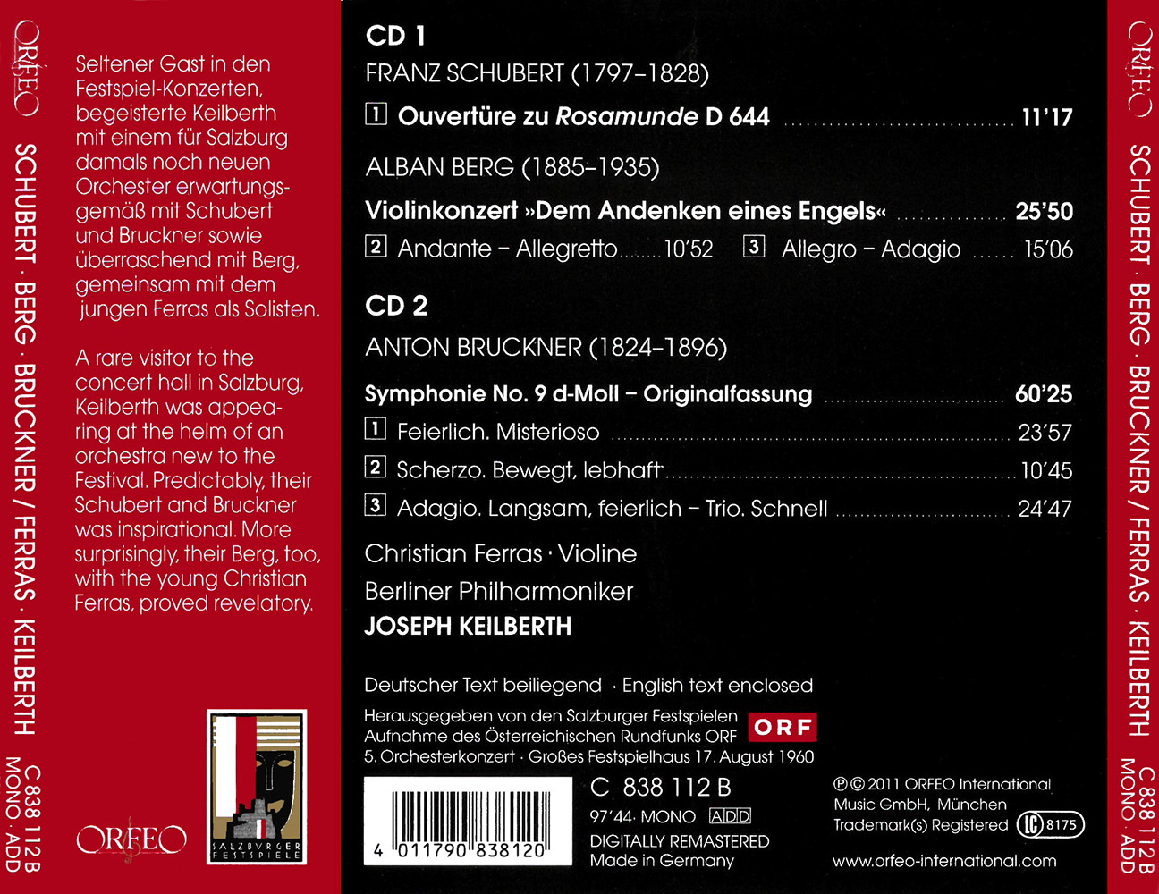 At a time when Herbert von Karajan was leaving his mark on the Salzburg Festival, there was still room for other leading conductors. Indeed, his plans for the repertory, which included the decision to invite other guest orchestras to Salzburg in addition to the Vienna Philharmonic, would hardly have been realizable at all if he had not been willing to tolerate distinguished rivals, a willingness that may even have inspired the competition. Among the conductors who returned repeatedly to Salzburg from 1957 was Joseph Keilberth, and if he did not appear even more frequently at the Festival, this was no doubt due first and foremost to his workload, which included not only Salzburg but also the Bayreuth and the Munich Opera Festivals. But whenever he had a gap in his schedule, Salzburg, too, could look forward to an undoubted high point in its calendar, as was the case in 1960, when Keilberth appeared with the Berlin Philharmonic for a musically varied programme made up entirely of works by Austrian composers. The concert’s fleet-footed opening took the form of Schubert’s so-called Rosamunde Overture (actually the overture to the opera Die Zauberharfe D 644), which was followed by Berg’s Violin Concerto (“In Memory of an Angel”), not a work that one typically associates with Keilberth, but his reading of the piece with the young soloist Christian Ferras makes it clear that he found Berg’s music eminently accessible, making it all the more regrettable that at the time of his premature death in 1968 he was still hesitating to take Wozzeck into his repertory. He was on more familiar ground with Bruckner’s Ninth Symphony, which brought his 1960 Salzburg Festival concert to an end in a particularly festive and musically distinguished way.