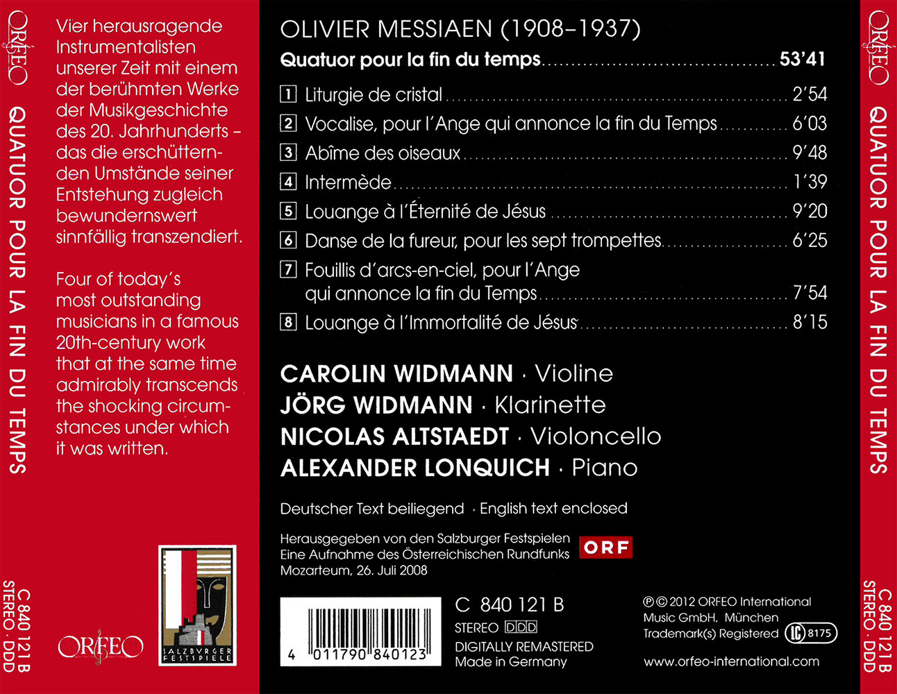 In 2008, Carolin Widmann, Jörg Widmann, Nicolas Altstaedt and Alexander Lonquich performed Olivier Messiaen’s Quartet for the end of time for violin, clarinet, cello and piano with the seriousness of spirit and subtle understatement that the work requires. Composed in 1940 in a German prisoner-of-war camp, Messiaen here reached a pinnacle of his composing career at the age of just 31. In this work he conveys to his listeners his spiritual interpretation of (musical) time and plays of colour. With these four exceptional chamber musicians, all masters of their art, the Salzburg Festival was treated to an exemplary performance of this work.
