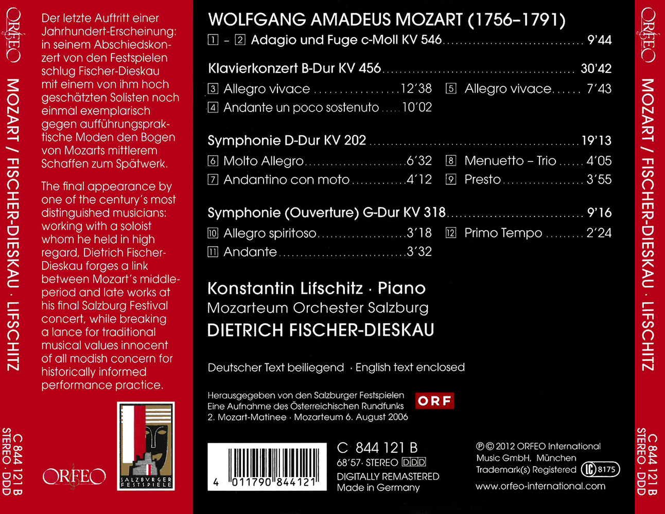 However spectacular the Salzburg Festival may be, and however indebted to international stars, it is also remarkable for the sense of continuity it has shown over the years. This is a fact tinged with melancholy when one considers the half-century in which Dietrich Fischer-Dieskau played a determining role at the Festival as singer, reciter and as conductor. His last concert in Salzburg, in which he conducted the Mozarteum Orchestra, is now available in the CD series Festival Documents. In a concert devoted entirely to Mozart, the pianist Konstantin Lifschitz was not just a soloist but a real partner in dialogue in the Piano Concerto K 456. The concert begins in solemn fashion with the Adagio and Fugue K 546 and ends in elation with the “Italian” Symphony K 202.