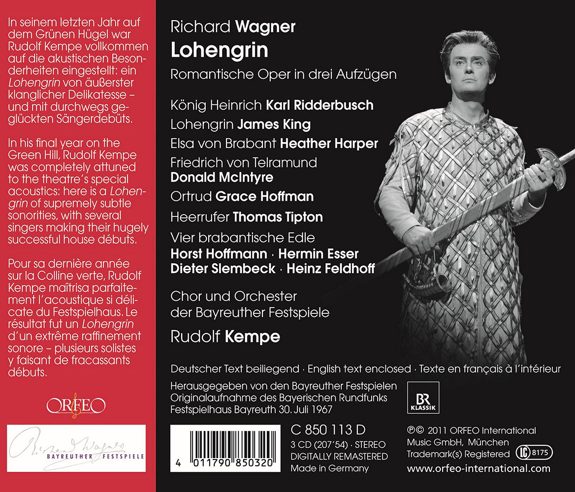 In the year of the premiere of Wolfgang Wagner’s second Lohengrin the eponymous hero found himself in a tight spot. At the end of the 1950s Sandor Kónya had taken the scepter in Bayreuth from Wolfgang Windgassen as the principal Knight of the Swan; at the height of his career in 1959, Kónya featured on a recording opposite Elisabeth Grümmer as Elsa (Orfeo C 691063). On the evening of the 1967 premiere of the new version however, the Hungarian tenor was gravely indisposed. No fewer than four tenors then stepped into the breach to sing his part. The first of them, James King, promptly sang his way to gaining “first night rights” for the following year. In 1968, however, Rudolf Kempe was no longer on the rostrum, though he was key to the success of the live recording of the second performance in 1967, which is now available on the Orfeo label (C 850113). Seven years earlier Kempe, with his sound instinctive feeling for music drama, had already plumbed the “mystic abyss” and conducted the entire Ring cycle. Yet his striving for continuous musical transparency resulted in an ever stronger degree of refinement. The 1967 Lohengrin may undoubtedly be viewed as the crowning glory of this development.