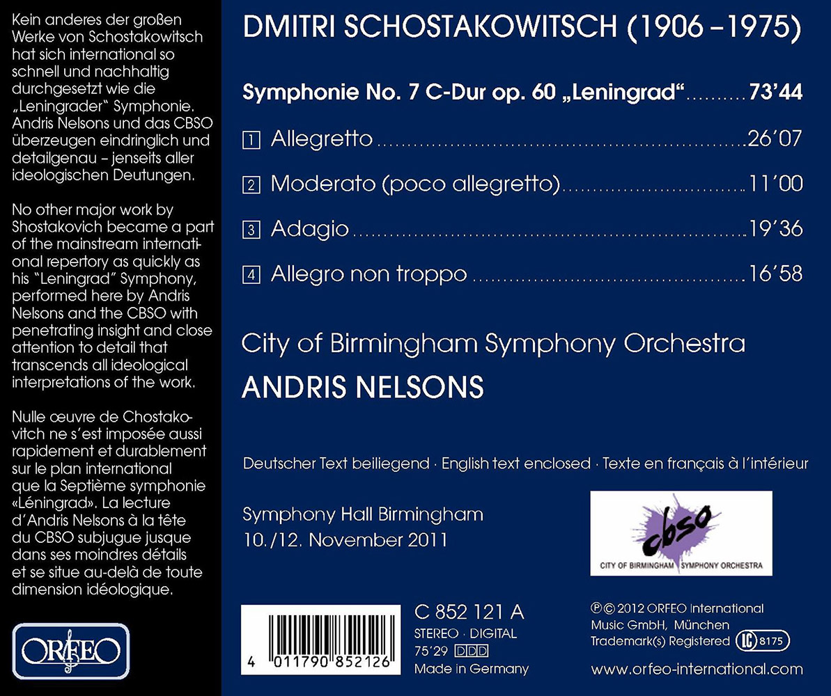 Foto: Marco BorggreveThe almost idyllic opening of the first movement and the disruption of that mood by the sudden irruption of a series of timpani rolls, together with the themes associated with a military attack, remain etched in the memory in spite of the final frenzy bound up with the idea of victory, and the same is true of the emotional highs and lows of the middle movements, in which listeners are torn between subdued trust and chorale-like solemnity in the tradition of some of Shostakovich’s great Russian predecessors, especially Modest Mussorgsky, enabling him to lend his voice to the tormented soul of a nation above and beyond all ideological divisions. It was no doubt passages like these that led to the rapid worldwide dissemination of the work once the microfilmed score had reached the United States after an adventurous journey via the Middle East. A new chapter in this exciting performance history of the symphony has now been written by the City of Birmingham Symphony Orchestra under its music director Andris Nelsons with a thrilling reading notable for its musical focus and depth and, not least, for its contrasts between rhythmic power and lyrical tenderness. The monumentality of Shostakovich’s Seventh Symphony emerges to particularly moving effect in a performance in which garish primary colours are banished in favour of balance.