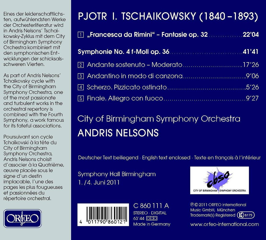 A recent recipient of ECHO Klassik's award as “Conductor of the Year”, Andris Nelsons is now continuing his series of highly acclaimed recordings with the City of Birmingham Symphony Orchestra. More especially, he is continuing his exploration of Tchaikovsky's symphonies. The Fourth Symphony and Francesca da Rimini were deliberately chosen in that they both mark a new stage in their composer's development and reflect his attempt to process and sublimate his deep personal crisis of 1876-7. The figure of Francesca da Rimini was inspired by Dante's Inferno, where she embodies a type of forbidden love unable to find redemption. In turn she inspired Tchaikovsky to write a symphonic fantasy both gloomily oppressive and lyrically expansive. Andris Nelsons and his orchestra succeed in squaring this circle of Hell by ensuring that the musical contrasts are organically interrelated, while losing none of their tension and excitement, and this remains true from the threatening chromaticisms of the introduction, which demonstrates that there is no way out of this particular Inferno, to the magnificent climax of the lament evoking Francesca's torments in love. Andris Nelsons' performance of the Fourth Symphony follows a similar trajectory, albeit on a much bigger scale, producing an exquisite aural experience. At the beginning, the fate motif in the brass avoids all garishly empty effects but is built up in an oppressively multilayered manner, while the following dance-like scalar runs and rhythms in the strings and woodwinds seem to be cautiously groping their way forwards, victory ultimately achievable only by dint of a struggle, yet even when they climax at the end of the opening movement they are unable to assert themselves in the face of the implacably recurrent fate motif. The elegiac second movement likewise pursues a quasi-circular course, starting out from the ascending and descending melodic line of the finely accented solo oboe. In the third movement's pizzicato writing and wind figurations, there is a palpable sense of enjoyment on the musicians' part, which in the final movement creates a positively overwrought impression. The decision to return to life through contact with the “people” (and with their songs), which Tchaikovsky explained was the driving force behind this passage, is altogether overwhelming here: it is a remarkable feat of orchestral sonority.