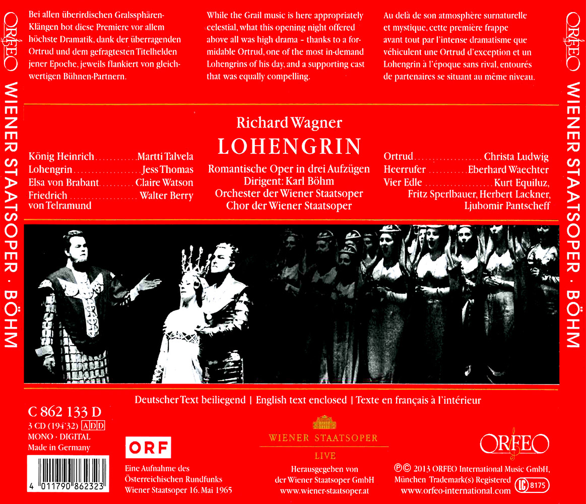 For a performance of Richard Wagner’s Lohengrin to be completely successful, it depends largely on the “evil” couple who stand opposed to the Swan Knight and the girl he protects, Elsa. The 1965 production at the Vienna State Opera was acclaimed for its musical aspects, and on its opening night Christa Ludwig as Ortrud made evident why Wagner himself described this character as “terribly magnificent”. Christa Ludwig celebrates her 85th birthday on 16 March 2013, and with her interpretation of roles such as this she secured for herself a place in the annals of the Vienna State Opera. Her curse (“Entweihte Götter!”) was accorded spontaneous ovations by the audience. And the subtlety that she brings to this role – straddling as it does the range of a dramatic soprano and a dramatic mezzo – makes this sorceress the undisputed manipulator of the action. All this can be heard clearly, too, on this live recording. With the dramatic baritone Walter Berry as Telramund, she had a partner on that evening whose vocal power was hitherto largely unsuspected – yet who offered no less vocal sophistication on account of it. Overall, the performance on that evening was stormier and more agitated than many a more “ethereal”, enraptured version such as one often hears. It was driven onwards with precision by Karl Böhm at the helm of the orchestra of the Vienna State Opera, and with a State Opera Chorus that had been excellently prepared by Wilhelm Pitz. Eberhard Waechter as the Herold and Martti Talvela as King Heinrich were powerfully resplendent, while Claire Watson as Elsa and Jess Thomas as the title hero formed the “good” couple, rounding off this superb cast with their bright tone colours. Her voice – schooled in Mozart – was slender and clear in focus, while his virile tenor, clear in accentuation and in diction, offered a model of the Wagner style of the 1960s that also dominated in Bayreuth (and was preferred by the director of this Vienna production, Wieland Wagner). This Lohengrin offered a modern reading in the best sense of the word, allowing the characters their mythical grandeur while at the same time letting them approach the contemporary audience as men and women of flesh and blood.