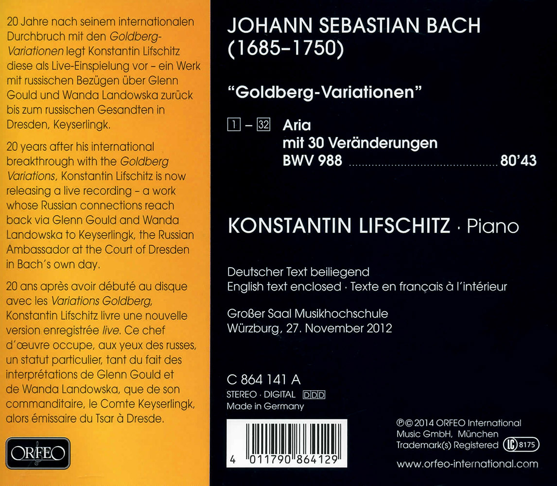 This live recording is being released 20 years after Konstantin Lifschitz’s final concert at the Gnessin School. He played the Goldberg Variations there as part of his school-leaving exams at the age of 17, and performed it otherwise several times in concert at the time. This was back then still “unusual, even very, very daring”, and Lifschitz remembers how it seemed to him at the time that even the great Mrs Kantor (his teacher) was “almost envious” of him. Lifschitz himself has never missed an opportunity to try out the work on the organ or harpsichord, though he has never ever considered giving a public performance on one of those instruments. He has often performed the work in his piano recitals and has done so on all five continents.