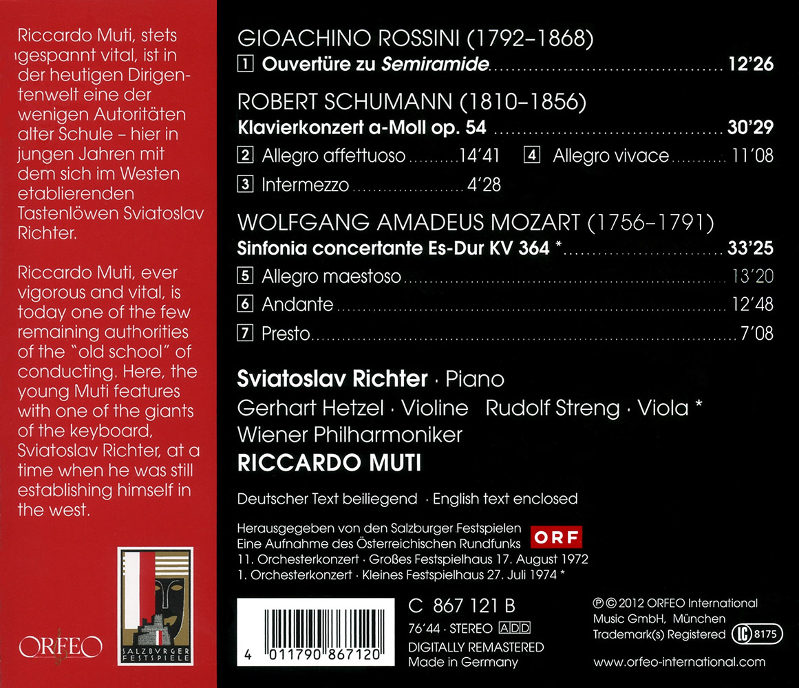 Of the artists active today, Ricardo Muti has already been a welcome guest at the Festival for more than forty years. His first conducting engagements there did not just provide the basis for his current “telepathic” relationship with the Vienna Philharmonic, but also brought collaborations with important soloists of the older generation. Thus the new CD in the series Festival Documents includes the Piano Concerto by Robert Schumann under Muti’s baton, with Sviatoslav Richter once more proving the uniqueness of his pianistic gifts. Over and above all its virtuoso challenges, Richter and Muti together give an account of the work triumphant in its formal cohesion and in which they sculpt it as a large-scale musical arch. Muti’s deep understanding of Rossini and Mozart – represented here by the Overture to Semiramide and the Sinfonia Concertante K 364 respectively – is also clearly evident in these early recordings.