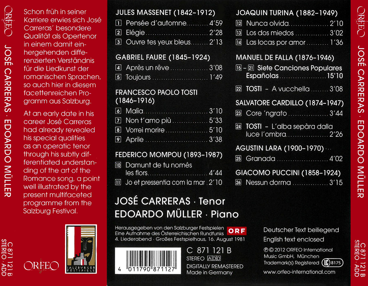 Although no longer a regular guest, José Carreras was in the 1970s and ’80s one of the great, up-and-coming singers and he returns in 2012 once more for a song recital in Salzburg on August 30. Accompanied here by Edoardo Müller, his recital of 1981 takes us from the French song with piano by Massenet and Fauré via the tenor “classics” of Tosti to the canciones of De Falla, Mompou and Turina – and all sung with a secure sense of style and with great subtlety. Carreras’s encores delighted adherents of the brilliant tenor repertoire, and can be appreciated on this recording too.