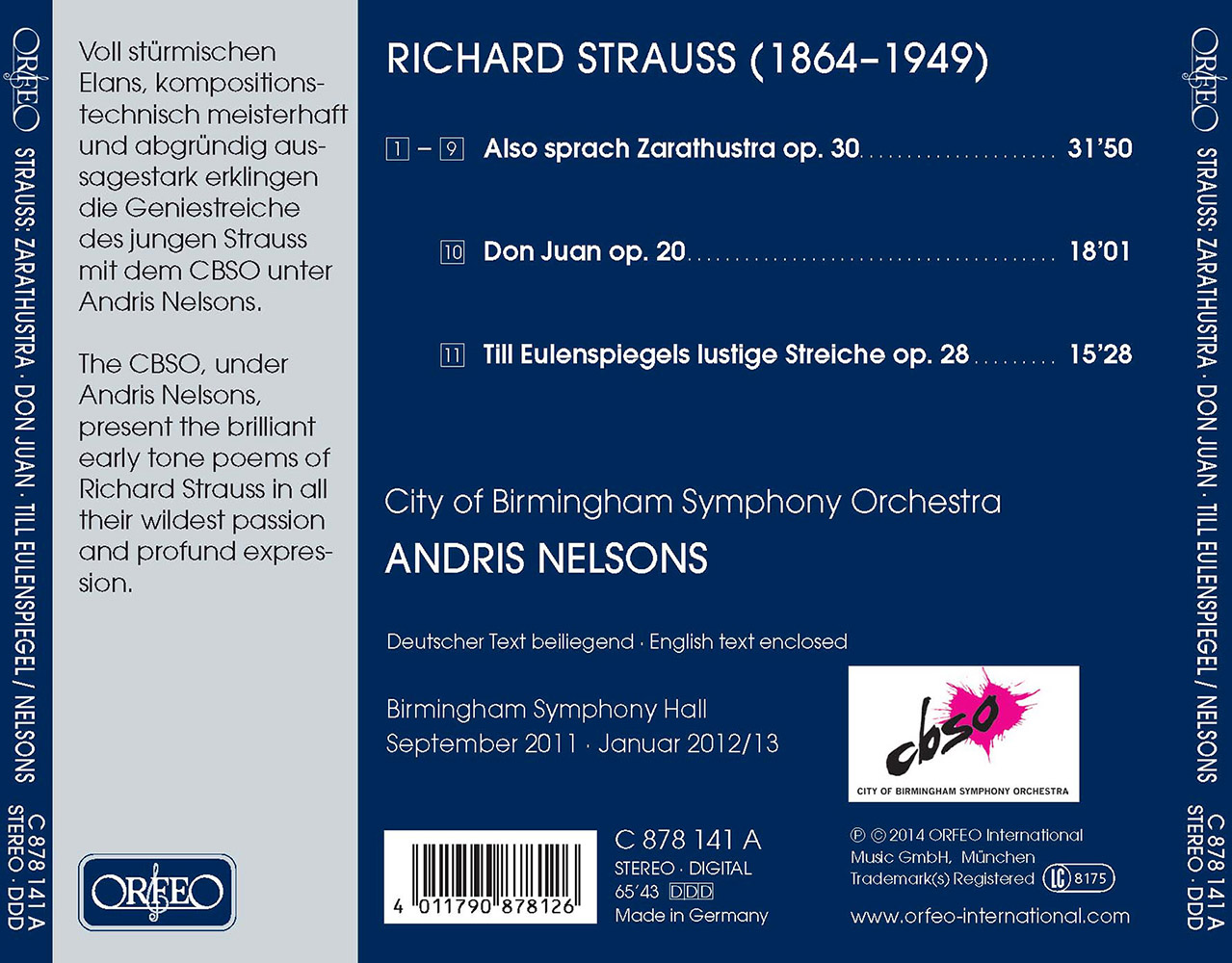 In this year of Richard Strauss’s 150th birthday, it seems natural that the City of Birmingham Symphony Orchestra under Andris Nelsons should add another candle to the birthday cake, as it were, given that their recordings of Ein Heldenleben (Orfeo C 803 091) and An Alpine Symphony (C 833 111) were among the most successful, prize-winning recordings of recent years. This time, the CBSO and its music director Nelsons offer us a selection of the early tone poems: Don Juan, Till Eulenspiegels lustige Streiche and Also sprach Zarathustra. In Don Juan, Strauss succeeded for the first time in mixing the ingredients that would prove the basis of his success over the coming decades. Along with his big tunes and orchestral virtuosity, there is also a dash of immorality and a slightly wacky humour. Andris Nelsons and the CBSO plunge with delight into the Don’s life of adventure and conquest that comes to an abrupt halt in the final, general pause before he dies in a duel. The macabre end of Till Eulenspiegel, with the hanging of the protagonist, is preceded by a witty exploration of just about every possible orchestral timbre, with Strauss pulling out all the stops to depict Till’s pranks in music. The CBSO once again proves itself a world-class ensemble that is homogenous across all the sections of the orchestra. And this is just what’s needed for the great tone poem Also sprach Zarathustra, “freely based on Friedrich Nietzsche” (as Strauss himself wrote), in which the orchestra under Andris Nelsons achieves a marvellously subtle interpretation, doing equal justice to Zarathustra’s address to the sun and to the mysterious close in which the motives of Man and Nature alternate in their respective keys. In between these two extremes, Nelsons and the CBSO give absolutely everything that this score demands, from its storms of passion to its slithey fugues and the high camp of Zarathustra’s Dance Song. This new recording must undoubtedly already be counted among the highpoints of the current Strauss Year.