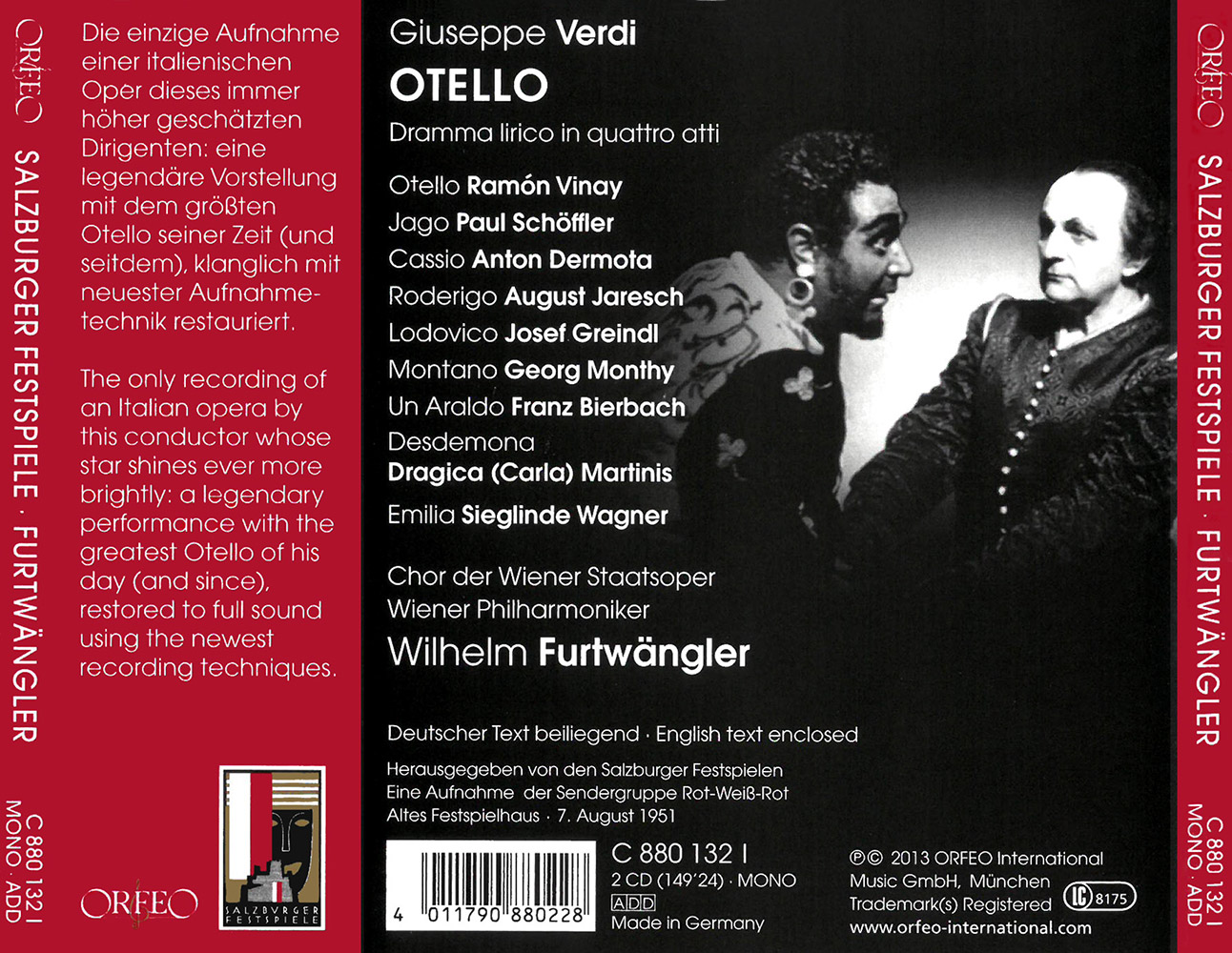 The requirements of running a festival must at times seem paradoxical: exceptional artists are gladly engaged time and again, but at the same time the uniqueness of their achievements is devalued by this repetition. One of the personalities who for years helped to mould the image of the Salzburg Festival was undoubtedly Wilhelm Furtwängler. But the fact that he conducted Verdi’s Otello in the summer of 1951, on the 50th anniversary of the composer’s death, was one of those coups that give a festival its particular appeal. At the helm of the Vienna Philharmonic, Furtwängler succeeded on the opening night in turning the audience’s surprise into enthusiasm. The thoroughly symphonic conception of this late opera score of Verdi’s was brilliantly transformed by Furtwängler into a kind of “psychological drama” of its title hero, sung by Ramón Vinay at the height of his vocal powers – a tireless heldentenor with a rich variety of shadings in his voice. As the scheming Iago, Paul Schöffler’s extraordinarily sophisticated baritone was his equal, just as Dragica Martini, at the beginning of her international career, proved a perfect Desdemona, possessed as she was of a most graceful soprano voice. Great pains had been taken to cast the production, right down to the less extensive roles (for example, Anton Dermota sang Cassio and Josef Greindl was Lodovico), and together with the chorus of the Vienna State Opera, which had been excellently prepared, the result was a performance of Otello that is regarded as exemplary to this day and is now available on CD, its sound fully restored.