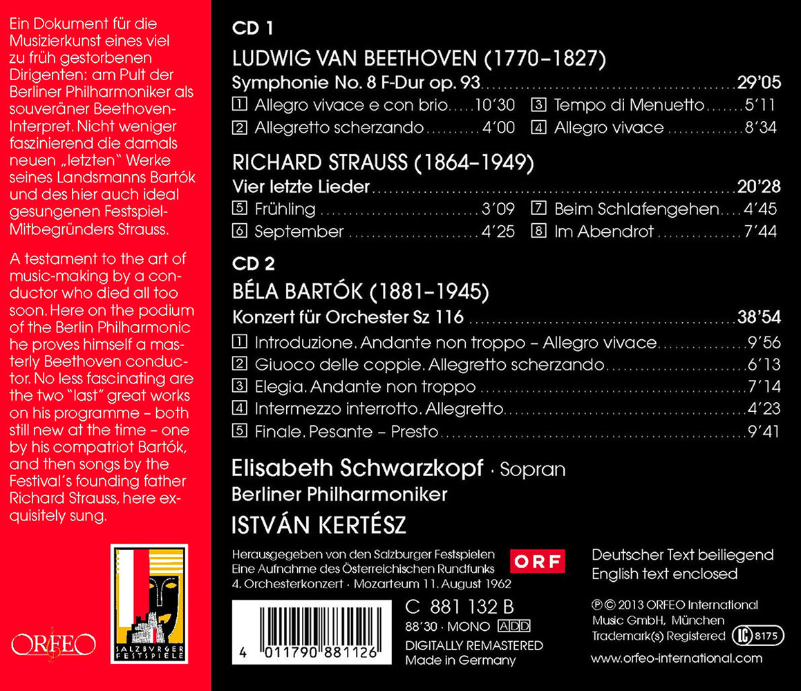 István Kertész’s early death from a swimming accident in 1973, aged just 44, meant that he performed very little in Salzburg. In the previous decade he had quickly established himself as a first-class conductor of the younger generation with a large repertoire ranging from the Viennese classics to the Modern. In Salzburg in 1962 he confirmed his reputation, conducting the Berlin Philharmonic in a programme that reached from Ludwig van Beethoven’s 8th Symphony via Richard Strauss’s Four last songs to Béla Bartók’s Concerto for Orchestra, all of which made evident Kertész’s stylistic flexibility – everything was surging with energy and played with great lucidity. This concert (and thus the present recording of it) was further enriched by the presence of Elisabeth Schwarzkopf – a Strauss interpreter without peer to the present day.