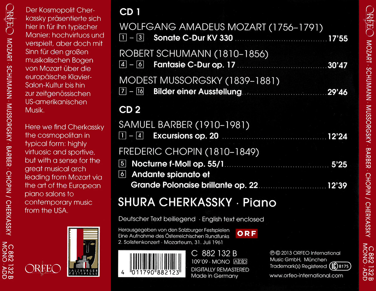 Shura Cherkassky was characterized by a degree of “unpredictability” not least in matters of programme planning. This pianist was several times a guest at the Salzburg Festival, but it was perhaps precisely his ability to display his virtuosity in music of the most varied constellations and epochs that meant he remained less fixed in the collective memory of the Festival audiences than did many a prominent colleague. But if one hears the recording of his solo concert from 1961, one is not surprised that the brilliance of Cherkassky’s piano playing was at the time appreciated as much as the sense of balance that he achieved in his interpretations. Thus in the concert documented on this CD he was able to follow a well-proportioned interpretation of Mozart’s Sonata K 330 with Schumann’s high-Romantic C-major Fantasy and then contrasted a powerful performance of Mussorgsky’s Pictures at an Exhibition with Barber’s trenchant Excursions. With Chopin’s Nocturne op. 55/1 and the Andante spianato et Grande Polonaise brillante, Cherkassky finally arrived at the composer with whom his name is perhaps most associated today.