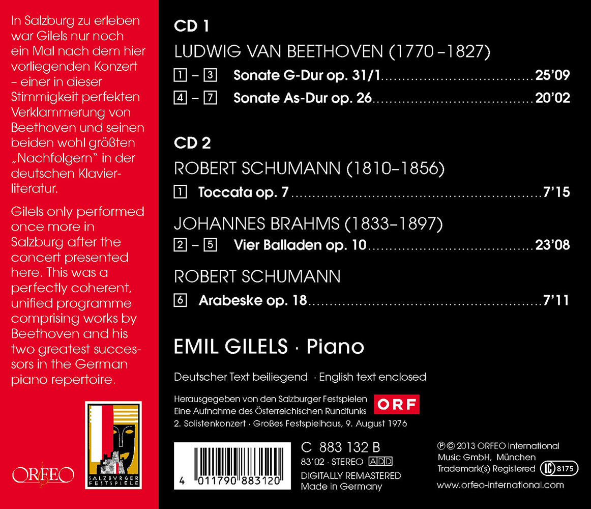 The Soviet pianist Emil Gilels also had a huge repertoire. He began his international career at a relatively late date and impressed one in particular with the carefully considered sense of unity and interconnectedness of his concert programmes. This was also the case in Gilels’ penultimate concert at the Salzburg Festival, in the summer of 1976. Beethoven’s middle-period sonatas op. 26 and op. 31/1 can rarely have been heard in such a rounded, masterful interpretation, so devoid of any superficial effects as is here the case in Gilels’ performance (even in the variation movement of op. 26). After the interval he moved on to Schumann (with the Toccata op. 7 and the Arabeske op. 18) and to Brahms (the Four Ballads op. 10), though this was far more than a mere musico-historical progression, for Gilels here entered into dynamic realms of extreme subtlety and tenderness alongside thundering eruptions, all of which gave expression to the manner in which these post-Beethovenian composers explored to the full the formal possibilities inherent in the music.