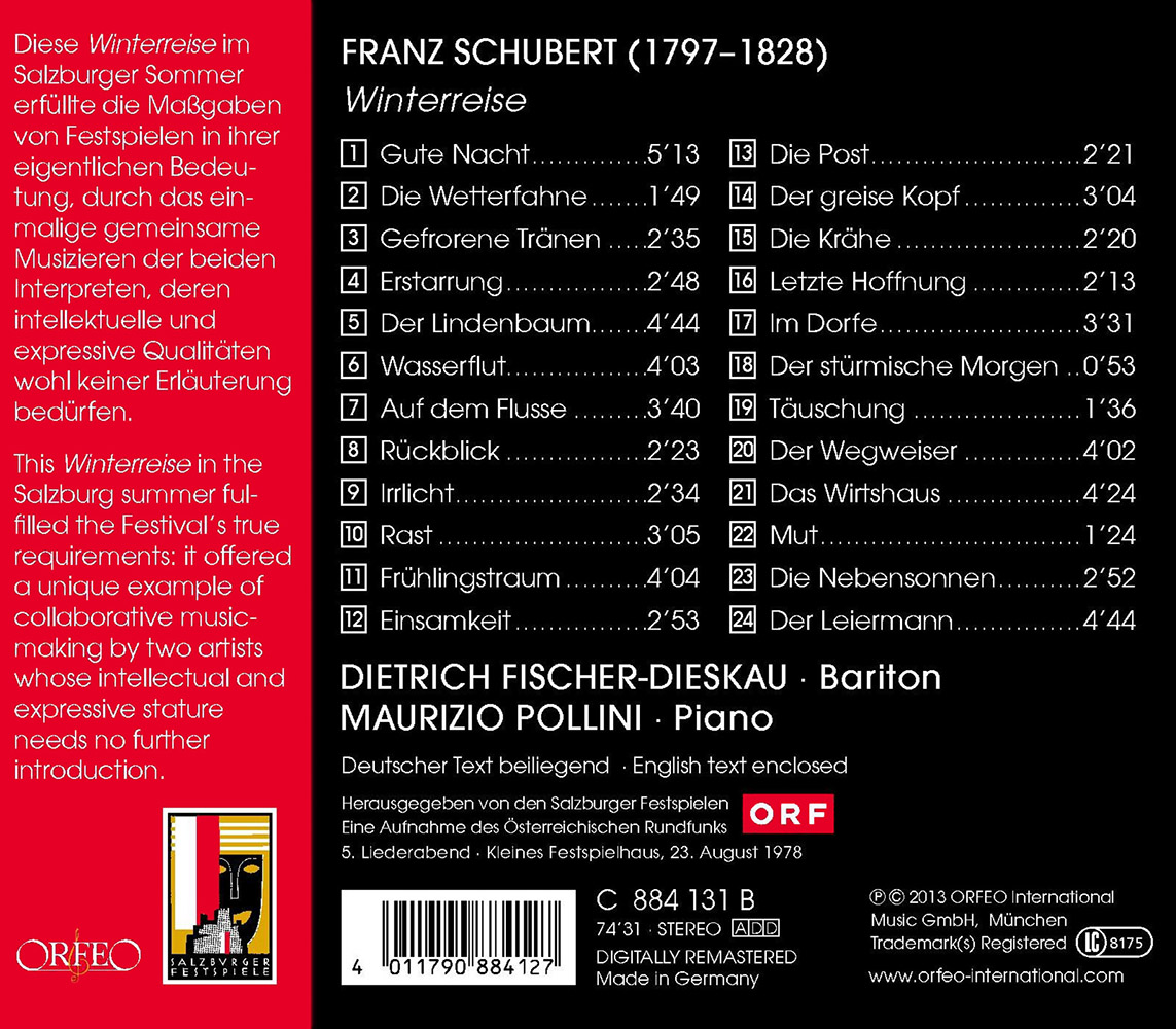 The privilege of performing Schubert’s Winterreise at the Salzburg Summer Festival is reserved for only remarkable artistic personalities. In 1978, Dietrich Fischer-Dieskau and Maurizio Pollini came together for the first and only time as a lied duo in order to perform this great cycle. We must be all the more grateful that the Austrian Radio recorded their encounter. The fact that this interpretation remained unrepeated is perhaps only explicable in that something so unique should perhaps remain thus. Fischer-Dieskau’s balance of words and music remains unsurpassed – here he also succeeded in creating a mighty, continuous arc of tension from the first to the last of the 24 songs. With his accents and details in the tempi and dynamics – at times quite startling – Pollini proved that the piano part in Schubert’s songs is far more than a mere “accompaniment”. It is not least Festival documents such as this that prove how great musicians often bring forth extraordinary things on unusual terrain.