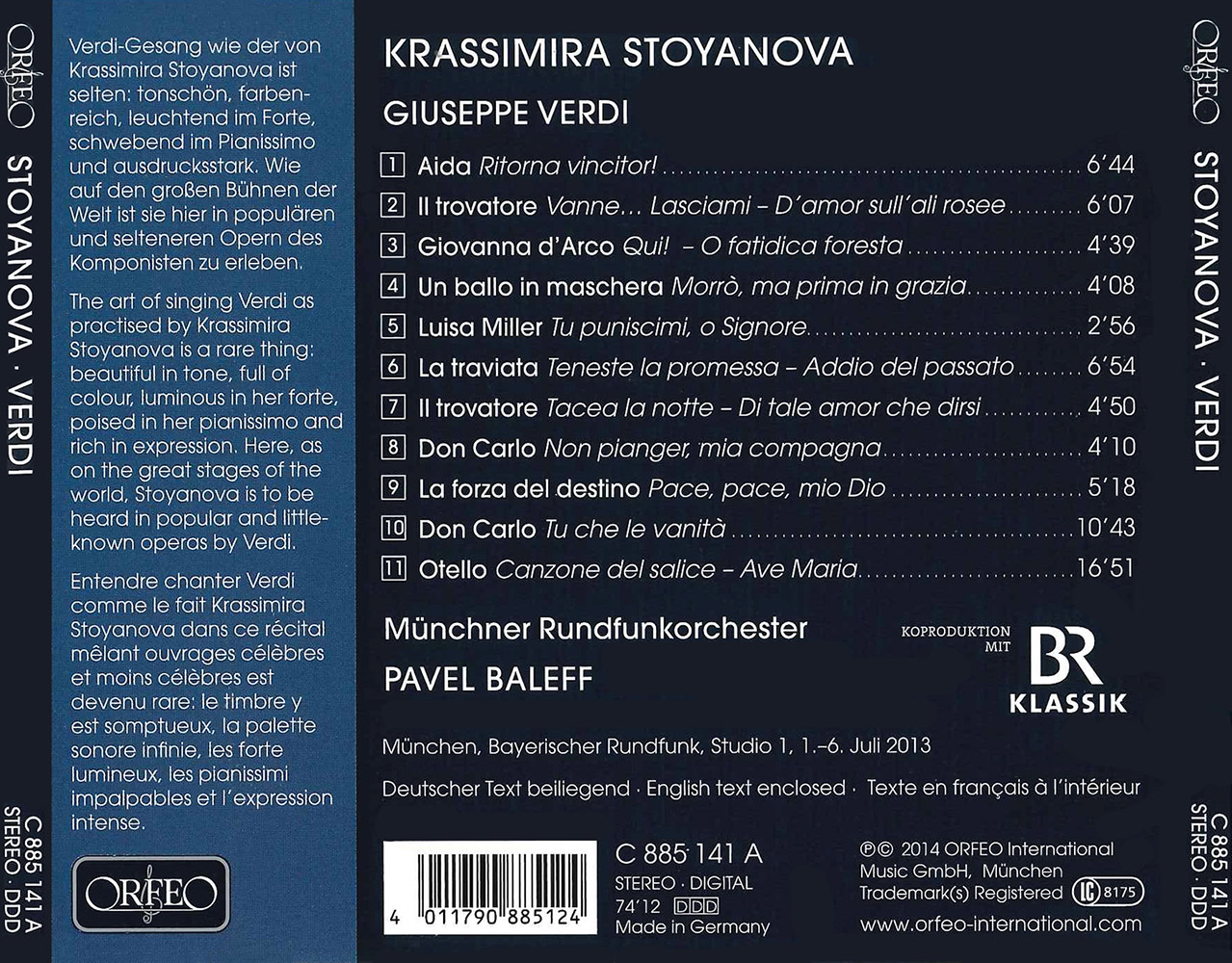 The year of Giuseppe Verdi’s 200th birthday might have come to a close, but his presence on opera house programmes has as little to do with such commemorations as does his general popularity. One of the most renowned Verdi sopranos today – whose fame began well before the “Verdi year” and will last long after it – is Krassimira Stoyanova, who now presents her newest solo CD with arias by the composer. Some of these roles she has already sung all over the world, while others she will be singing in the coming years. From Otello we naturally find Desdemona’s “Willow Song” and “Ave Maria”, since this is her most famous role. As Desdemona she has moved and enthused audiences and critics alike from Vienna to Barcelona and Chicago. In Verdi’s operas after Schiller, Don Carlo and Luisa Miller, Krassimira Stoyanova gave her celebrated debuts as Elisabetta and Luisa Miller at the State Operas of Munich and Vienna respectively. Since then she has become especially known both for her ability to shape a perfect, broad melodic arch full of expression, and for her emphatic characterisation of these two women, caught as they are between love and duty. The two “Leonoras” in Verdi’s Il trovatore and La forza del destino make more dramatic demands on the voice, and Krassimira Stoyanova is approaching these roles in a manner both prudent and composed; she has not yet taken the latter completely into her repertoire. The dates for her debuts as Aïda in the eponymous opera and as Amelia in Un ballo in maschera have now been fixed, and she can also be heard in excerpts from both roles in this new CD with the Munich Radio Orchestra under Pavel Baleff. The roles that Krassimira Stoyanova has sung less frequently up to now (though no less successfully) include the title roles of Giovanna d’Arco and La traviata, excerpts from which can also be heard on this CD. Despite the differences between these roles, one marvels once again at Krassimira Stoyanova’s artistry, at her unmistakeable, unmannered, unostentatious, refined soprano voice, as she does justice both to the girlishness of Verdi’s Joan of Arc and to the wrenching farewell offered us by the dying Violetta Valéry.