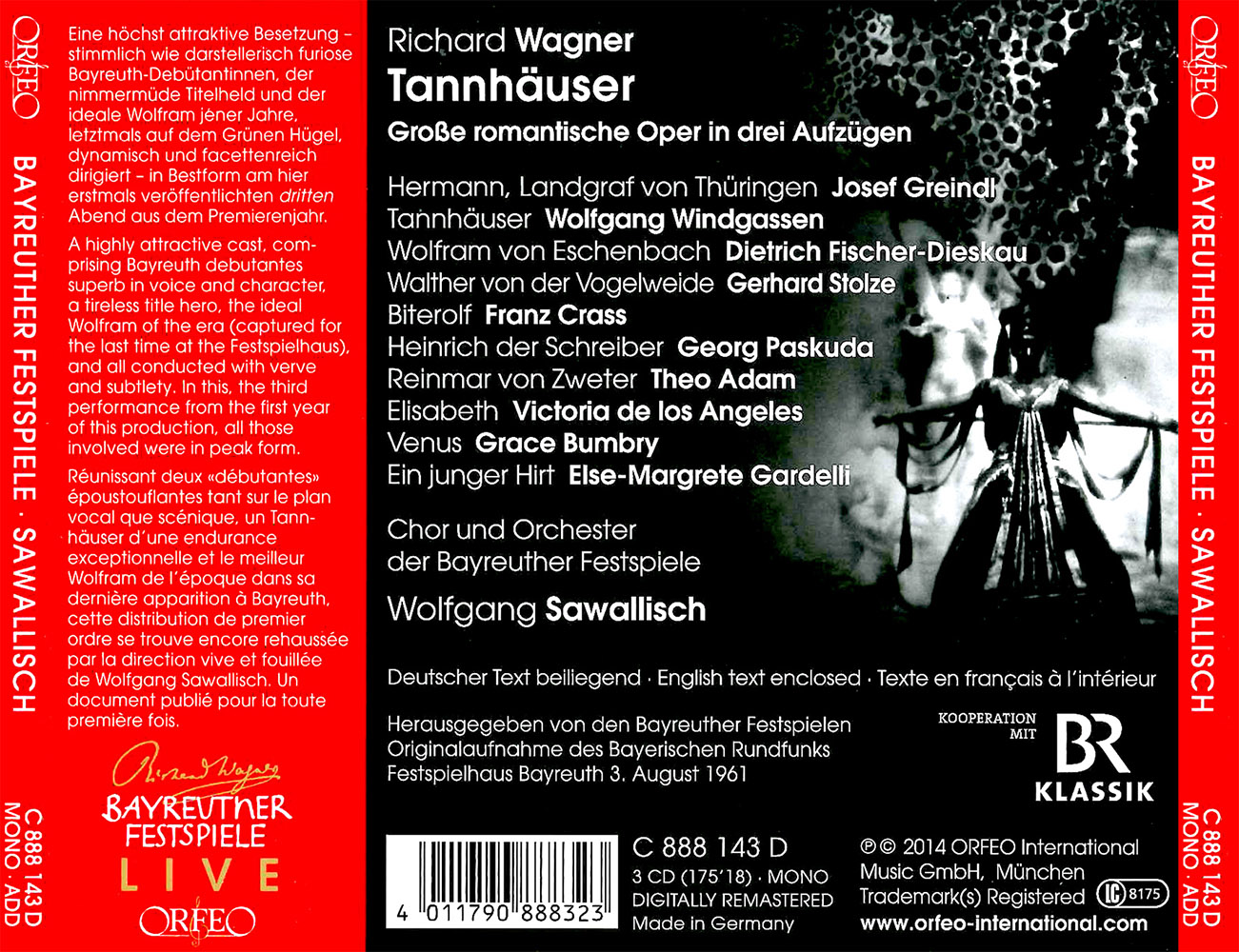 The first performance of a series, they say, isn’t always the best. But this basic tenet of the theatre also deserves closer examination with the benefit of hindsight. At first glance, connoisseurs of the Bayreuth Festival and its recording history will think there can be little that is new about a live recording of the Bayreuth Tannhäuser that Wieland Wagner directed in 1961, conducted by Wolfgang Sawallisch. It was only in the following Festival summer that Sawallisch’s achievements on the rostrum were particularly well documented in audio form, with Wolfgang Windgassen as the title hero and, alongside him, Grace Bumbry in her international breakthrough role as the “black Venus”. But in 1961, Victoria de los Angeles sang Elisabeth and Dietrich Fischer-Dieskau (at his last Bayreuth Festival) the role of Wolfram. As the critics noted, the opening night suffered not just from what were presumably the usual first-night tension and nerves, but also from the adverse, rainy weather that dogged the first week of the Festival and that meant the common cold was doing the rounds. The discovery in radio archives of a Tannhäuser from the second of the subsequent performances is thus a real find, and it is being released on CD in 2014 in the series of historical recordings of the Bayreuth Festival. By a stroke of luck, all the protagonists were on form on the evening of 3 August 1961, as we can now hear for the first time. This allowed Wolfgang Sawallisch to maintain his stringent reading of the Tannhäuser score. His tempi were taut, but still allowed for a decisive hint of elasticity, with slight rubati and adjustments according to the phrasing of the individual singers. As so often in a cast that was assembled in large part by Wieland Wagner, we can here discern a balance between lyrical voices and a subtle, psychologically precise art of characterisation – which is particularly the case with Victoria de los Angeles, who sings the role of Elisabeth in a songlike manner, without any undue intensification towards a youthful-dramatic vocal interpretation of the role (which some of her colleagues have taken to excess). Dietrich Fischer-Dieskau outdoes himself once again as Wolfram, and the “parting couple” at the outset – Grace Bumbry and Wolfgang Windgassen – here achieve a perfect balance of love’s lust and sorrow (perhaps better than they ever had before, or ever would again). Sometimes a second attempt is worth more than twice the trouble.