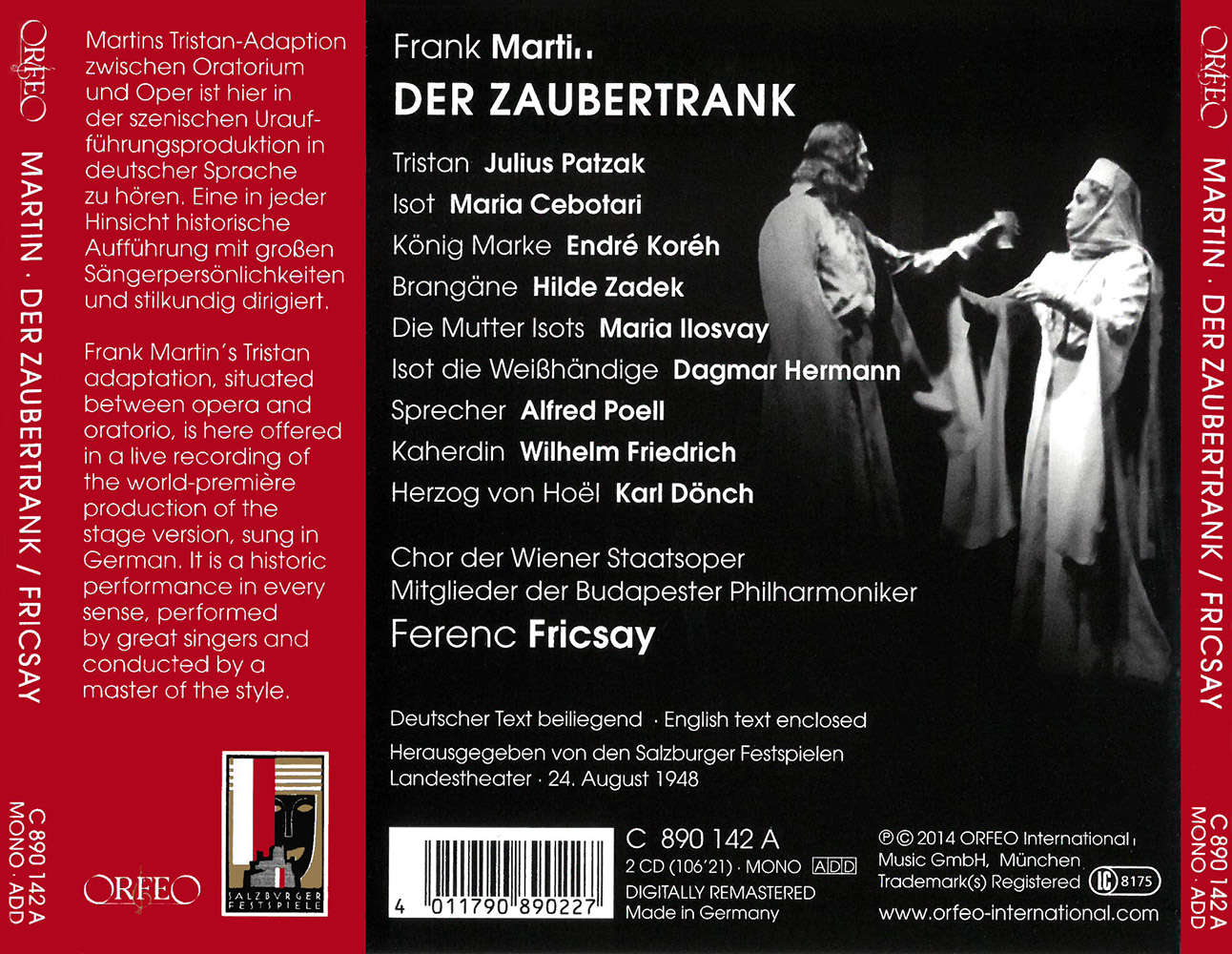 We have reason to remember another great conductor in 2014, as he would have turned 100 years old this August: Ferenc Fricsay. His career was cut short by his all-too-early death in 1963, but his interpretations in Salzburg set standards of excellence. This was certainly the case with the German-language stage première of Frank Martin’s Le vin herbé. This production is now available as a historic live recording. Fricsay makes a strong impression with his confident sense of style in this unusual musical idiom for the tale of Tristan and Isolde. Julius Patzak and Maria Cebotari sing the main roles – both very different from those in Richard Wagner’s opera, but sung no less expressively here. In contrast to Wagner, too, this opera has a balanced overall ensemble, and the Chorus of the Vienna State Opera under Fricsay gives an audibly committed performance.
