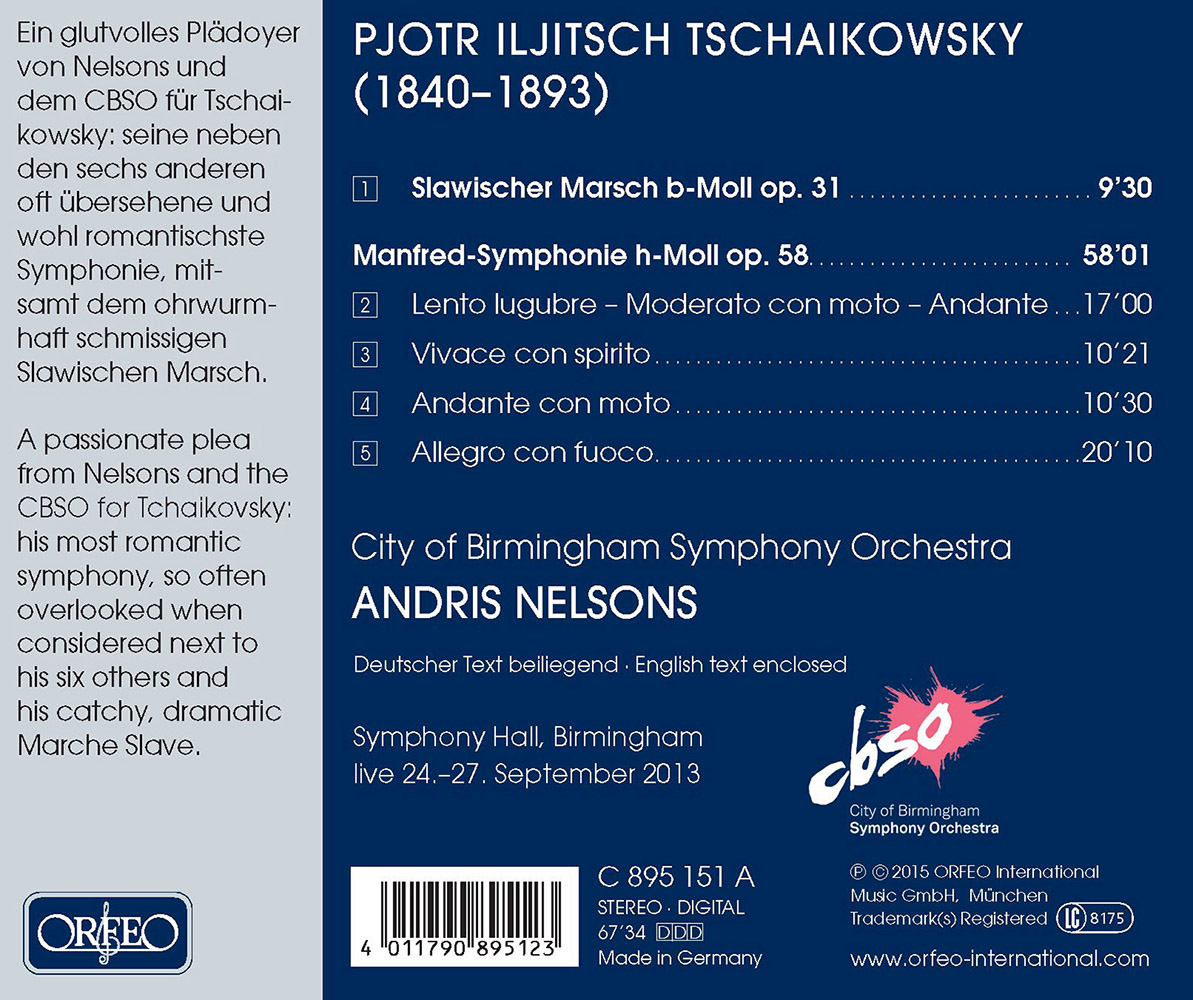 When considering the symphonic output of Piotr Ilyich Tchaikovsky, the Manfred Symphony in b minor, Op. 58 (1885), composed between the Fourth and Fifth Symphonies, has all too often been overlooked. The latter two symphonies exist already in award-winning recordings from the City of Birmingham Symphony Orchestra under Music Director Andris Nelsons (as does the Sixth Symphony – the “Pathetique”). Manfred, after Lord Byron’s dramatic poem of the same name now enriches this Tchaikovsky cycle through a number of remarkable facets.