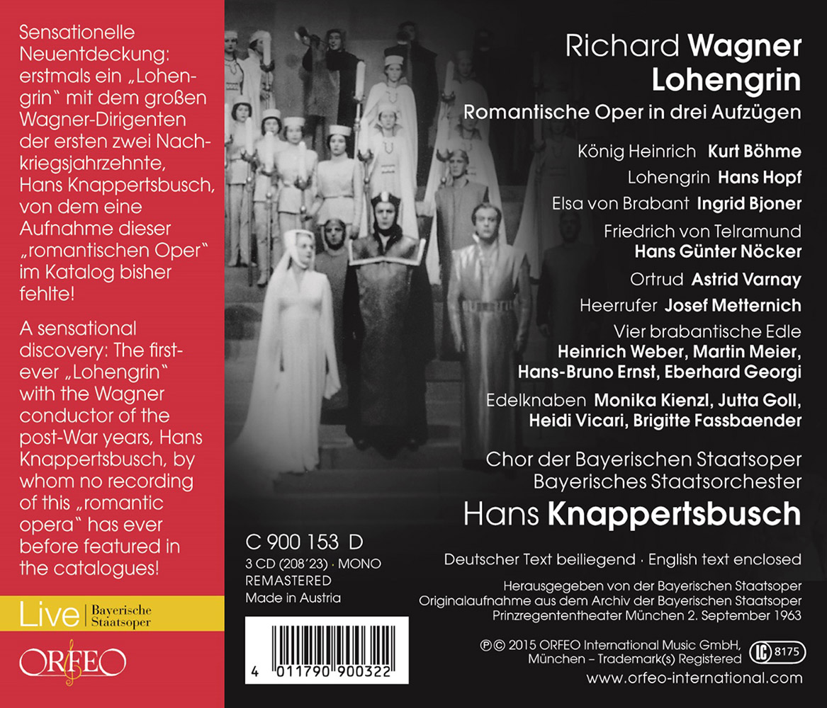 This is the kind of lucky find of which collectors and producers dream. It’s not just a new find of a hitherto unknown or unpublished performance of the nth recording of a work by a sought-after interpreter, but the first release of the first-ever recording of a work by such an artist. In the case of the greatest musicians, and most particularly when it comes to Wagner’s oeuvre, the awareness of a painful void is part and parcel of things – thus we have no Parsifal from Furtwängler (even though he conducted the work at La Scala after the War), and no early Wagner works under his baton; but in both cases excerpts have survived that make us wish all the more that we had complete recordings. Of course we knew – at least the experts among us did – that Furtwängler’s rival, the arch-Wagnerian Hans Knappertsbusch, did not just repeatedly conduct the difficult late works (to which his 1960 Meistersinger from Bayreuth is testimony, for example, which was recently released on this label). For he also conducted the Flying Dutchman and had a penchant for the lighter muse of composers such as Karl Komzák and Albert Lortzing. But who would have suspected that he conducted Lohengrin in post-War Munich no less than 16 times, and that there even exists a recording of it? After his Merry Wives of Windsor, this is now the second time that ORFEO is able to release a Knappertsbusch world première recording, both of them from the Prinzregententheater in Munich, his Lohengrin dating from just before the reopening of the National Theatre in 1963. Knappertsbusch came originally from Elberfeld in the Rhineland, but chose Munich as his home. And this “Wagner city” of Munich can be proud that he conducted Lohengrin here, but never did so in Bayreuth.