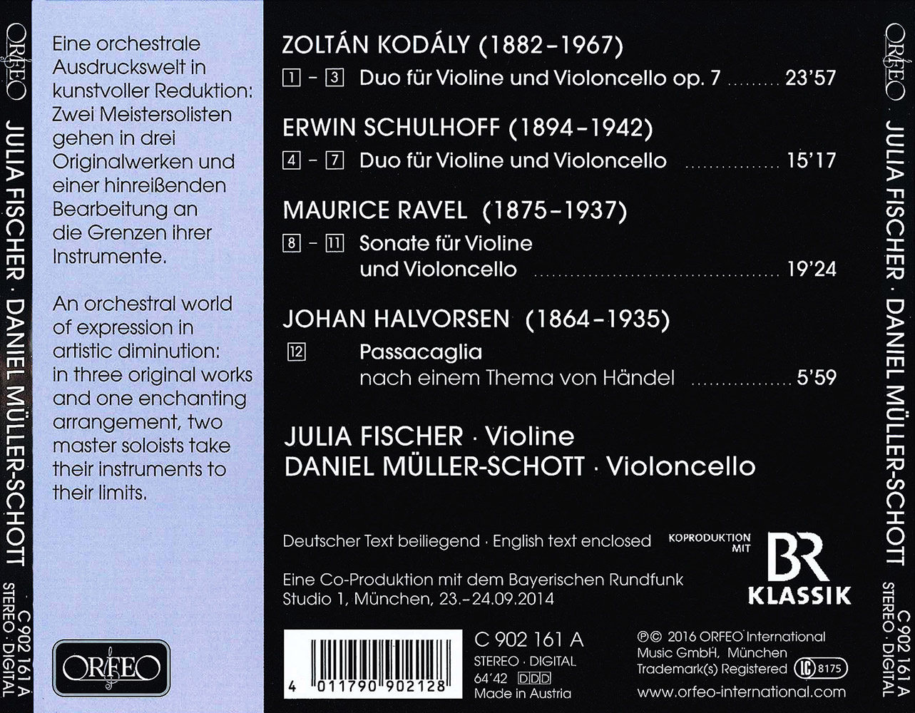 Duets for violin and cello are what might be called the lowest common denominator of sophisticated solo literature and chamber music. Much as each member of the present duo intensively cultivates the chamber music repertoire, they are both first and foremost soloists – and are bound to remain so in the extraordinary technical and musical challenges of this intermediate category. After the premiere of the Ravel sonata, a contemporary listener wittily pleaded for the publication of a reduced version for orchestra.