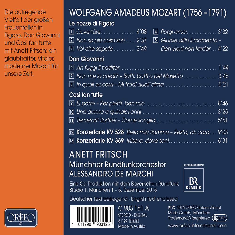 It is not often that a young vocal artist releases a debut CD that is so “complete” or so convincingly conceived and finished to such a high polish as is the case with Anett Fritsch. What makes it all the more astounding is that she achieves this by singing arias from the Mozart/Da Ponte trilogy of Figaro / Don Giovanni / Così, masterworks by a composer regarded and feared in equal measure for the complexity of his writing. Yet the repertoire focus she has chosen is entirely in keeping with the soprano’s career to date: she began in her teens to appear on the stage in her home town of Plauen in Saxony and from 2009 to 2015 was an ensemble member of the Deutsche Oper am Rhein (Düsseldorf), progressing in recent years through a series of acclaimed performances on international opera stages portraying Mozart’s principal female characters, astounding audiences with her versatility by playing several different roles from the same opera. This remarkable success can already be witnessed in permanent visual form on DVD – in Sven Erik Bechtolf’s productions of Figaro and Don Giovanni in Salzburg and Michael Haneke’s version of Così which caused such a stir in Madrid. What is more, in 2016 she played all of the important female roles in Le nozze di Figaro in the course of just five months: Susanna in Toulouse in April, Cherubino in Munich in June, and La Contessa in Salzburg in August.
