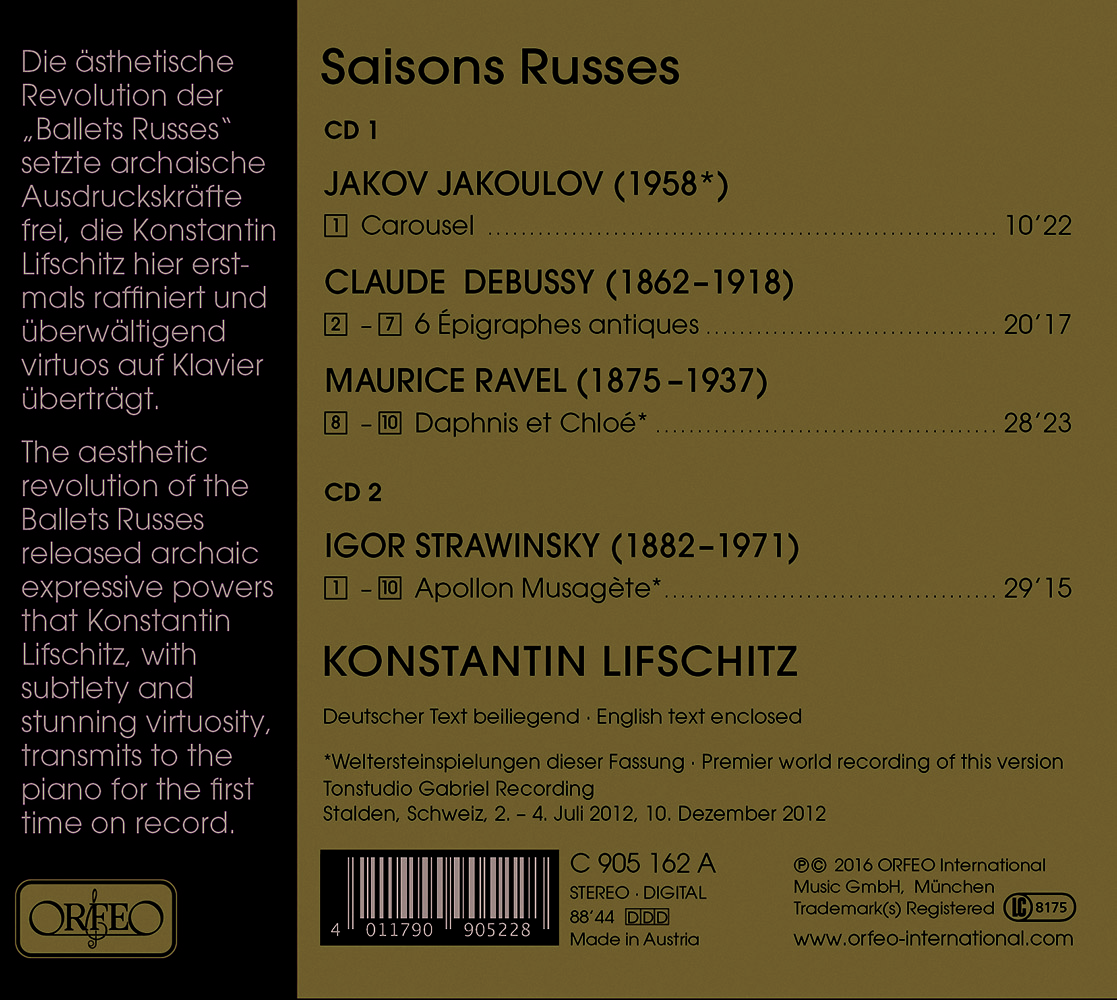 As with his previous CD releases, in choosing his programme Konstantin Lifschitz is concerned not just to find an interesting idea linking the works, but also to bring out the impact of new aural versions. The title “Saisons russes” refers to the pioneering aesthetic and musical developments initiated by the famous impresario Sergei Diaghilev and the legendary performances given by his Ballets Russes company in Paris from 1910 onwards. Many other contemporary composers were also involved in this development, foremost among them Claude Debussy, Maurice Ravel and Igor Stravinsky. The works by these three composers, presented together on this CD, are linked by their treatment of material based on myth and legend, and their use of new musical techniques.