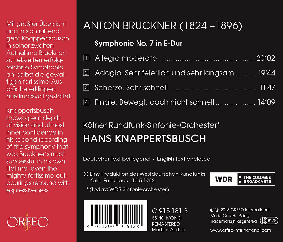 Before the great wave of Bruckner conducting that has taken place since the 1970s, it was Hans Knappertsbusch (1888–1966) who stood out as unquestionably one of the most important Bruckner exponents, and Bruckner was part of his core repertoire. There are several recordings by him of the 3rd to 5th and 7th to 9th Symphonies, two in the case of the Seventh, a live recording from the 1949 Salzburg Festival with the Vienna Philharmonic (Orfeo 655061) and this transfer direct from the original tapes of 1963 (and not “off the air”) with the Cologne Radio Symphony Orchestra.