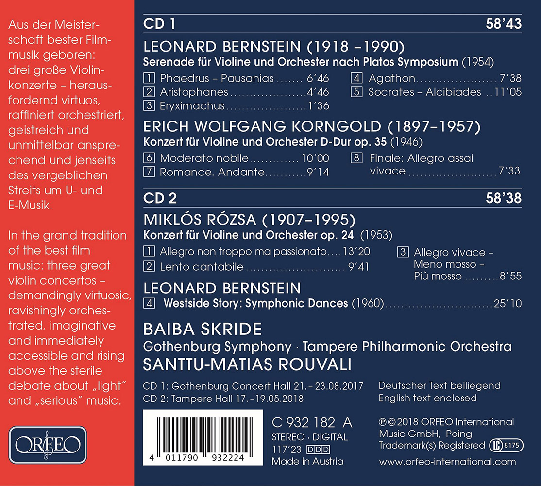In the new generation of genuinely American musicians, one outstanding figure was Leonard Bernstein, an all-rounder whose early success led on to even greater heights: here too, one can hardly ignore his contribution to film music, even if it amounts to one single film. Bernstein rated his Violin Concerto of 1954, “Serenade”, inspired by Plato’s Symposium, as his best work ever, and this work too in its imaginatively slimmed-down scoring for string orchestra, harp and percussion is now acknowledged to be an important 20th-century concerto for violin. Isaac Stern performed the premiere of the work with the composer conducting. As an “encore”, this compilation includes the masterly Symphonic Dances from the immortal “West Side Story”, which has long risen above the “fruitless wrangling” over “light” and “serious” music.