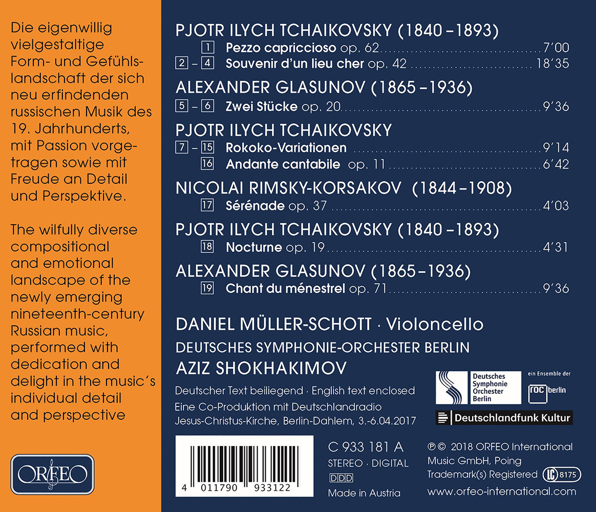 Apart from that the three composers are united by a complex and tense relationship portrayed in detail in the booklet in an extensive artist interview conducted by Meret Forster. Daniel Müller-Schott brings home to us how the Rococo Variations depict Tchaikovsky’s love of Mozart and his “modern”, nobly historical awareness of past times – along with his own intensive emotionalism. He also presents Tchaikovsky’s three-part “Souvenir d’un lieu cher”, a work scarcely to be heard in its original version for violin, now transposed to the cello by the soloist (having previously been orchestrated by Glazunov) who thus poses himself the ultimate challenge – while enlarging the cello repertoire.