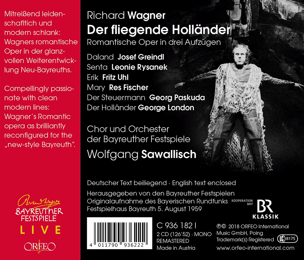 Although Wagner himself made it quite clear to King Ludwig II of Bavaria that the Flying Dutchman was among those works of his deemed fit to be performed in Bayreuth, the “Romantic Opera in three Acts” was not staged there till 1901, as the last of those ten. 1959 was a special year in “New Bayreuth”: by producing the earliest, Wieland Wagner had now presented all ten works under his own direction, in the first “Ring-free” year since the 1951 reopening – an abomination to hard-bitten old-school Wagnerians, for whom only the Ring and Parsifal genuinely belonged on the “green hill” of Bayreuth. There was once again heated discussion over the guiding principles governing the presentation of the festival – as reported, along with much else, in the well-informed and lively booklet-note by Festival public relations officer Peter Emmerich. But Wieland confounded and convinced his critics yet again with a “rediscovery” of his directorial idiom, described by him as “magic realism”. Musical success was achieved on the grand scale by the brilliant exponents of Senta (dubbed by Wagner “the woman of the future”) and the Dutchman – and by the musically modern slim-line conductor, who had made his successful Bayreuth debut not long before in the new production of Tristan (now on CD ORFEO C 951 183). Leonie Rysanek, whose singing gave vivid meaning to all the drama’s emotional aspects, also had the figure for the part – in her own words, she was the “slimmest Senta in the world”. With his powerful voice and darkly glowing male timbre, the inimitably elegant and empathetic George London remains without peer on this recording as elsewhere. Just as convincingly cast in its other roles, the work soon established itself in this second “New Bayreuth” staging even in its spiritual home. We would make a special point of observing that this historic audio document was captured not at the premiere performance, but during a second live recording on August 5, 1959.