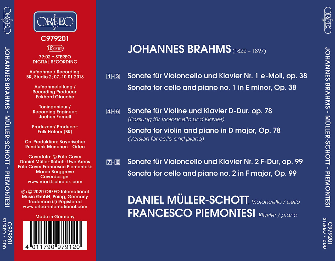 Daniel Müller-Schott and Francesco Piemontesi team up once more for this all Brahms program after the great success of their release of cello sonatas of the 20th century (C872151).