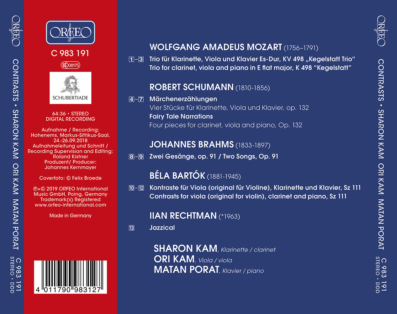 Sharon Kam is one of the world’s leading clarinetists. For her debut album on Orfeo (and performing for the first time in this trio line-up), she delivers a dramatic, sharply contrasting programme that is presented chronologically. Performing with her brother Ori Kam (viola) and the pianist Matan Porat, the programme begins and ends with music by Mozart and Bartók, the latter's Contrasts producing possibly the most original and captivating contribution to the repertoire for this combination of instruments. In between are works by Schumann and Brahms that contain multi-layered biographical references and are closely related in their romantic spirit.