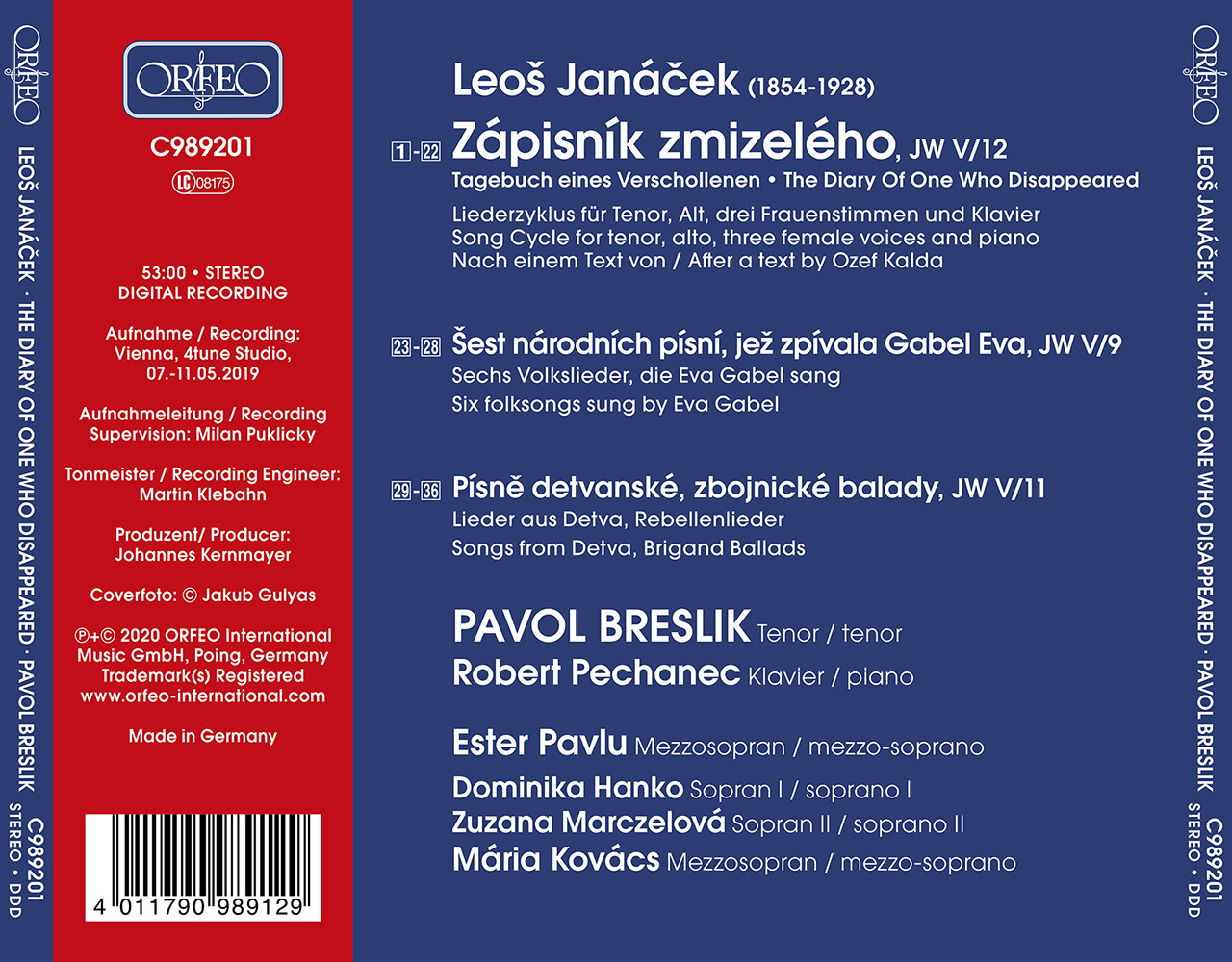 Leoš Janáček (1854–1928) composed the song cycle The Diary Of One Who Disappeared at a time when many people already considered him on a par with the other two masters of Czech national music, Smetana and Dvořák. The inspiration for the autobiographical ‘Diary’ came from a few enigmatic lines of poetry in two editions of the “Lidove noviny” (People’s Newspaper) of May 1916.